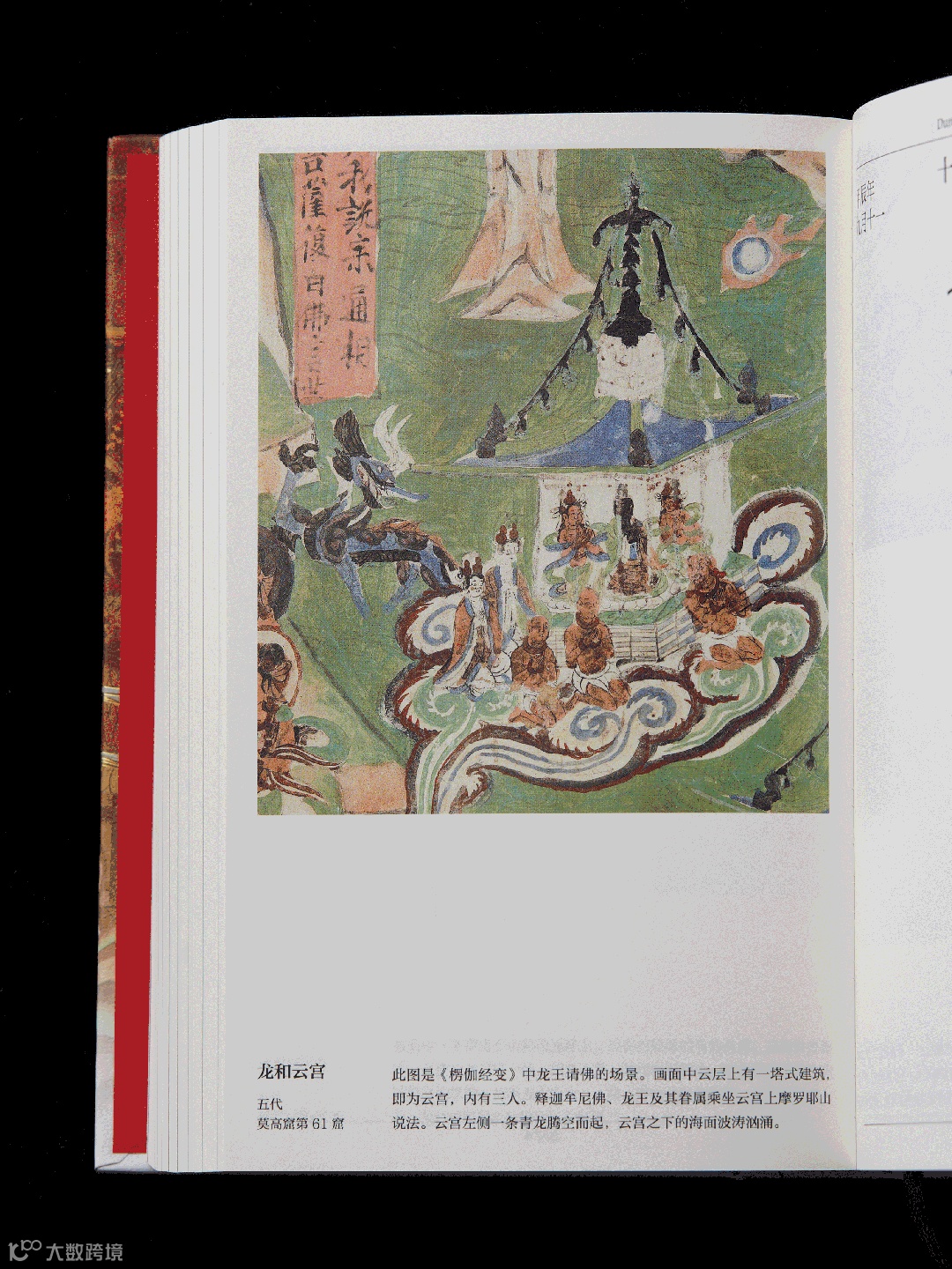 每一页左侧为壁画图,下面标注了壁画名称、创作时间、所在洞窟编号,以及专家对壁画的解读;