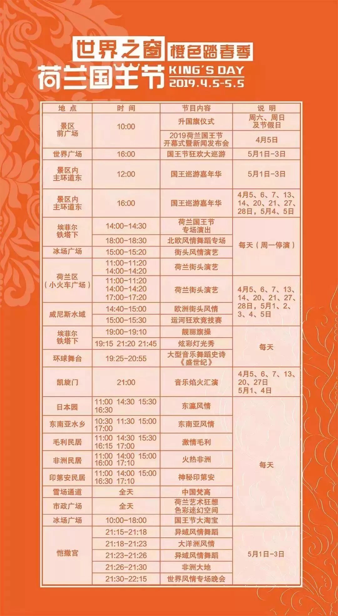 4月5日-5月5日期间,在世界之窗还有荷兰国王节活动的节目演出,可以参考下表喔~