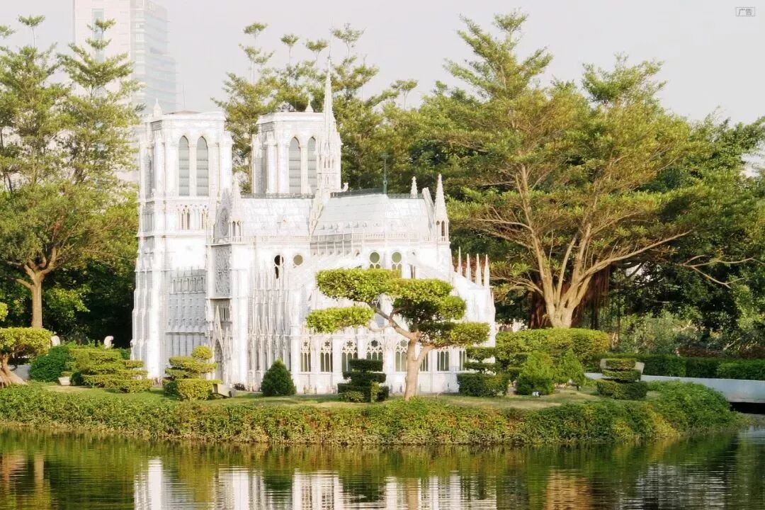 世界之窗的巴黎圣母院景点位于凯旋门旁,在绿树与池水的怀抱下,保留着原迹的风采。