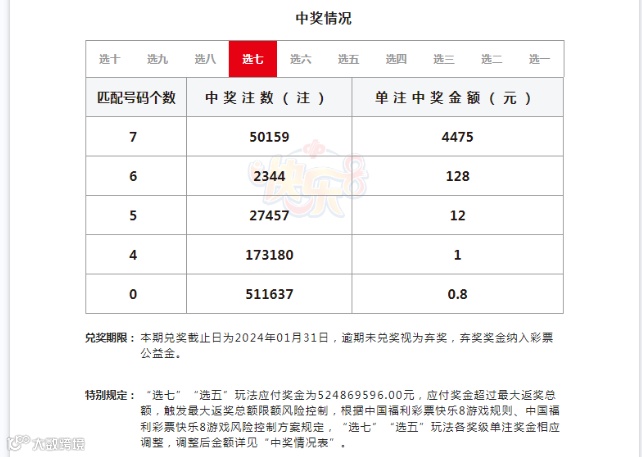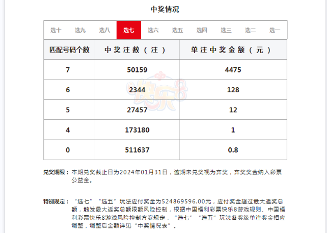 “选七”和“选五”中奖无数,把奖池都中爆了,均触发最大返奖总额风险控制。据江西日报报道,当期江西中出“选七中七”奖项5.01万注,其中南昌市中出5.0095万注。
