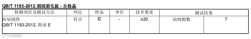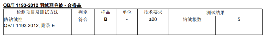 春秋被和冬被的钻绒根数仅为7和5,远低于技术要求的20。