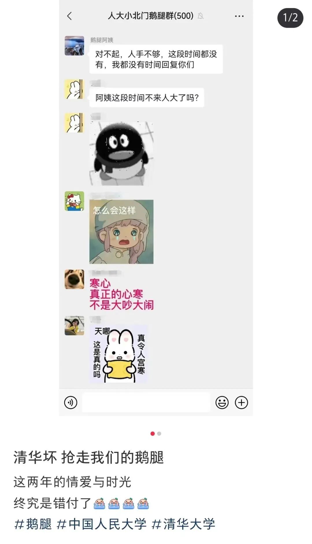 有网友在社交平台分享说,自从鹅腿火了之后每天都有好多人前去围观,在北大校门口围得里三层外三层,还有好多网红在现场直播,场面非常混乱。