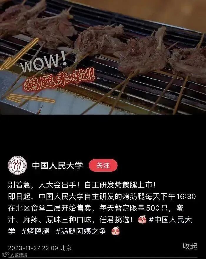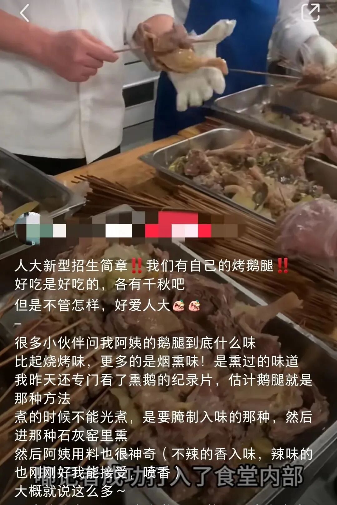据中国人民大学综合保障部官方公号消息,就在几所高校争夺“鹅腿阿姨”之时,中国人民大学食堂已悄悄上线了烤鹅腿。