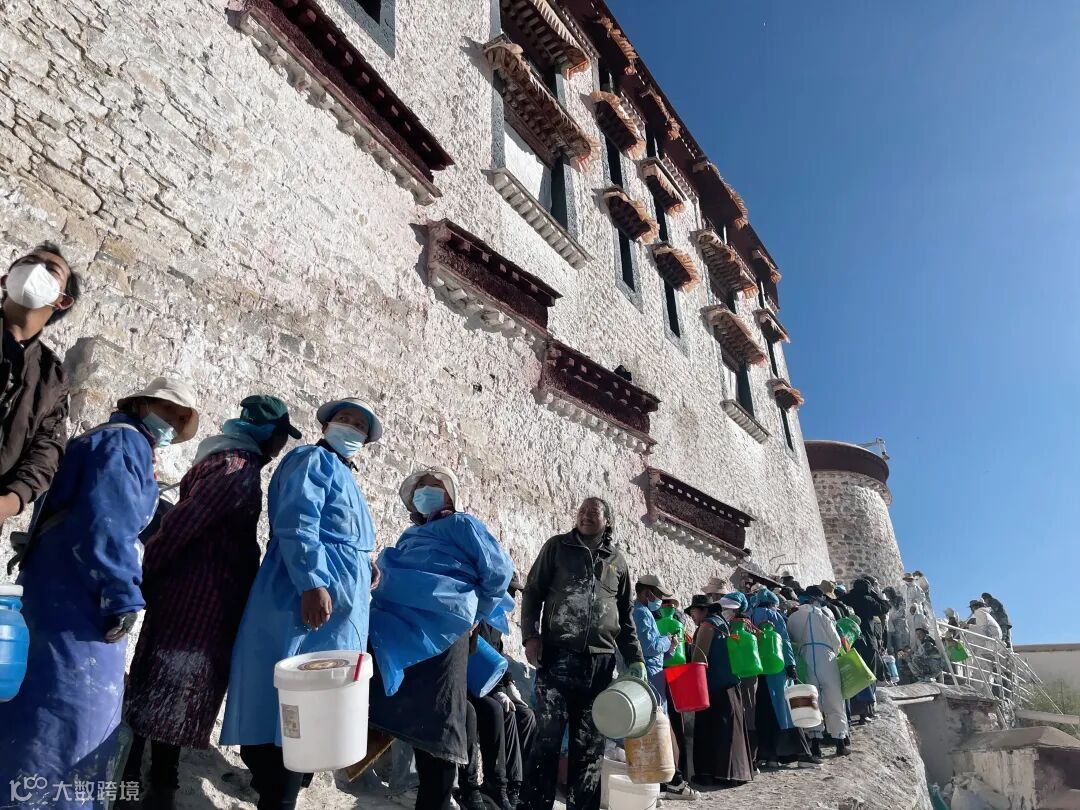 每年雨季过后,为使经过一年日晒雨淋的红墙白壁保持鲜亮光彩,在藏历九月“降神节”到来之前,布达拉宫外墙都要进行粉刷“美容”,很多当地民众自发带着工具来到布达拉宫做粉刷志愿者。