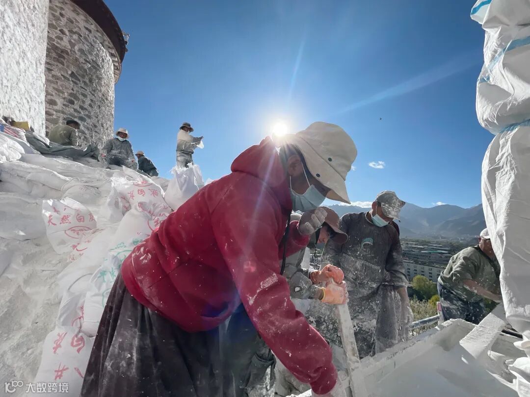经过滤后对布宫墙体进行喷涂,人力难以抵达的地方由专业人员悬吊喷洒涂料,将这座宏伟宫殿的墙体粉刷一新。