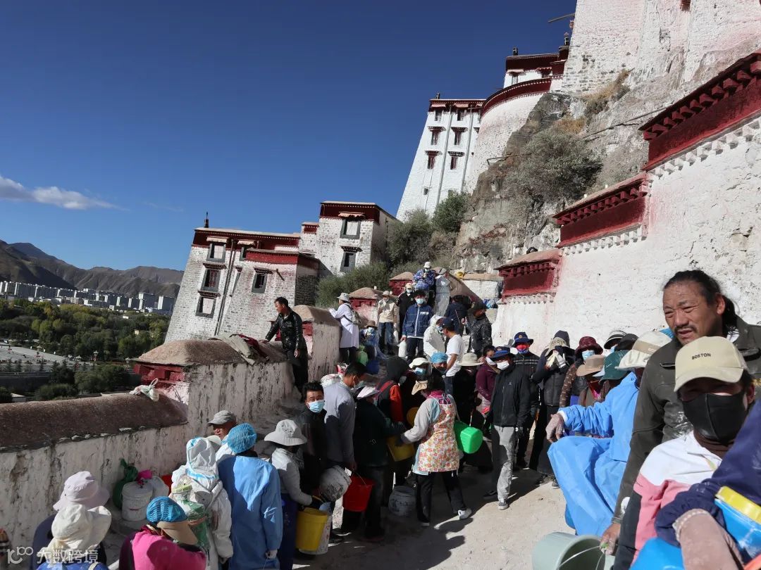 上午8点左右, 很多信教群众和工作人员身穿大褂、携带水桶和其他粉刷工具在布达拉宫西侧入口处排起长队,纷纷加入到粉刷布达拉宫外墙的工作中。对他们来说,参与到布达拉宫的粉刷是一种荣誉。