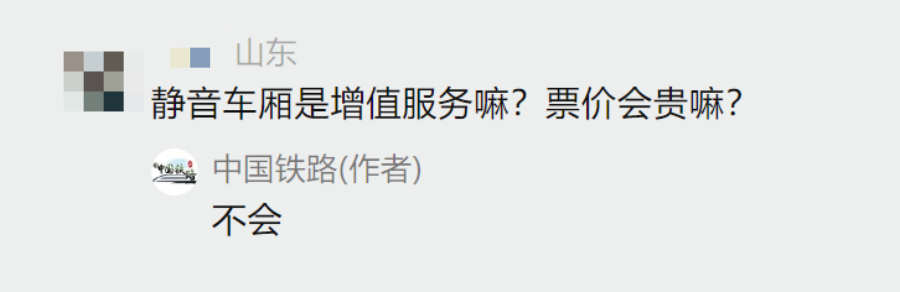 还有网友关心“静音车厢是否是增值服务”,中国铁路官方回复并非增值服务,是正常票价。