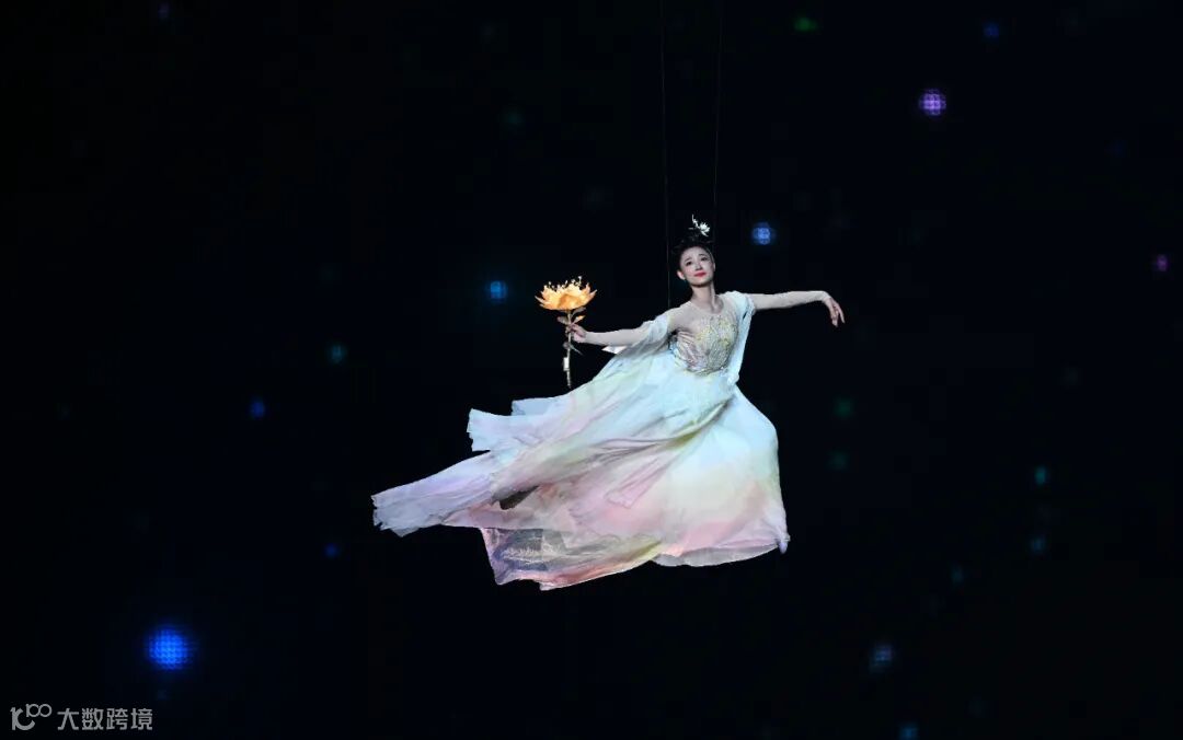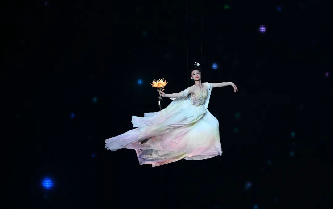 而在舞台上空,作为交融典型“江南”意象代表荷花、桂花的“荷桂少女”借助单人3D威亚技术,在空中超越边界、飞跃全场。
