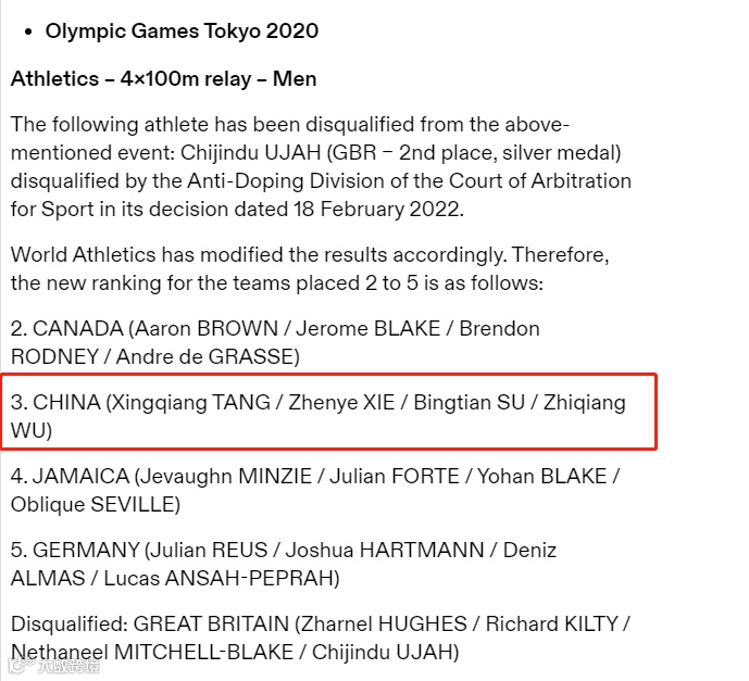 在东京奥运会男子4×100米决赛中,中国队原来位居第四。国际体育仲裁法庭2022年2月认定英国运动员乌贾在东京奥运会期间违反了反兴奋剂条例,因此英国队在男子4×100米接力决赛的成绩被取消,并被没收银牌。