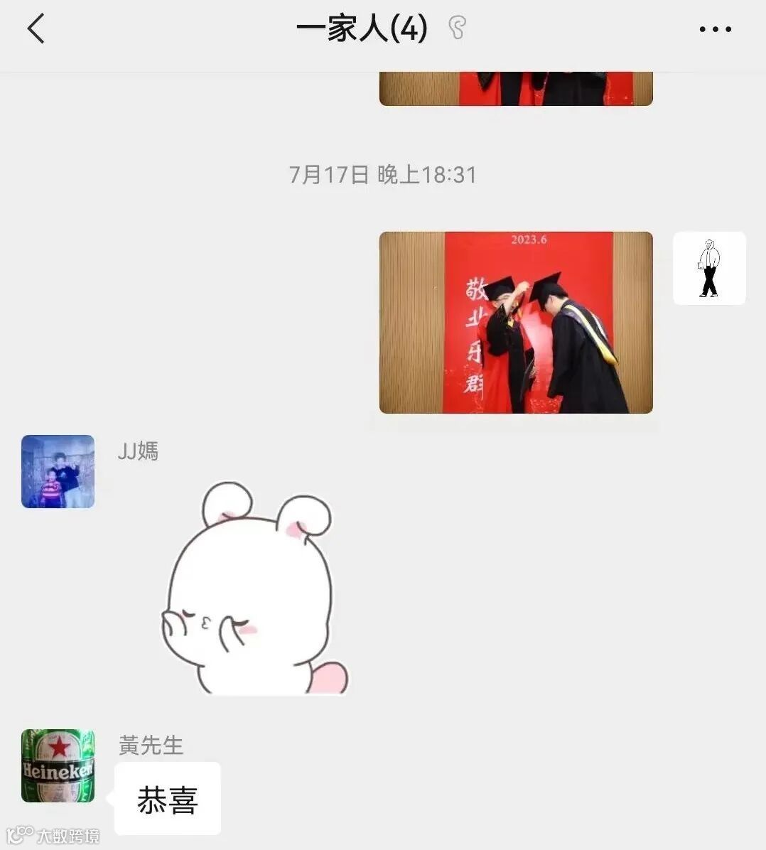 台湾青年黄隽杰在家庭群里分享毕业照 图源:受访者供图