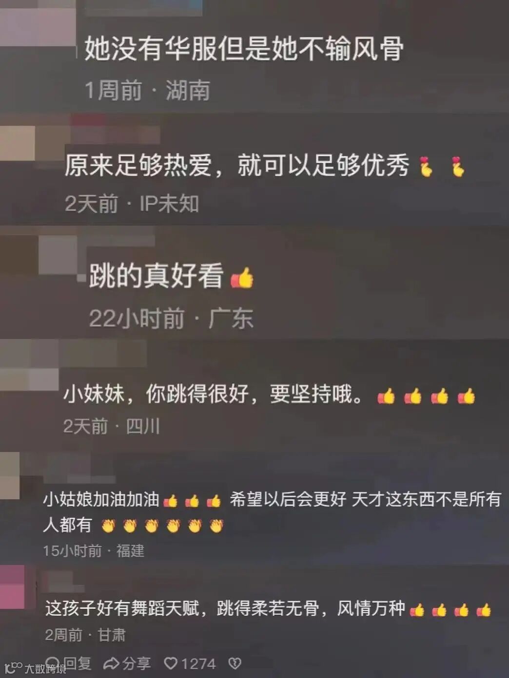 不少网友看后表示沉浸在舞蹈中的女孩整个人都在发光,也有网友说“她没有华服但是她不输风骨”、“足够热爱,就可以足够优秀”。