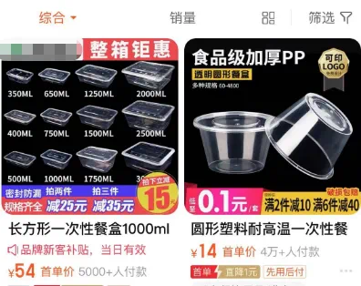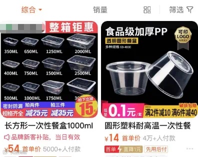 但如果在电商平台搜索“食品级PP材质加厚餐盒”会发现,根据大小不同,价格从每只4毛2到每只9毛钱不等;在某批发平台上,一次性四格餐盒批发价2毛8,1000只起批,一次性筷子四件套批发价1毛2元,100套起批。这样的价格和动辄四五块甚至十几块钱的打包费相比,差别悬殊。