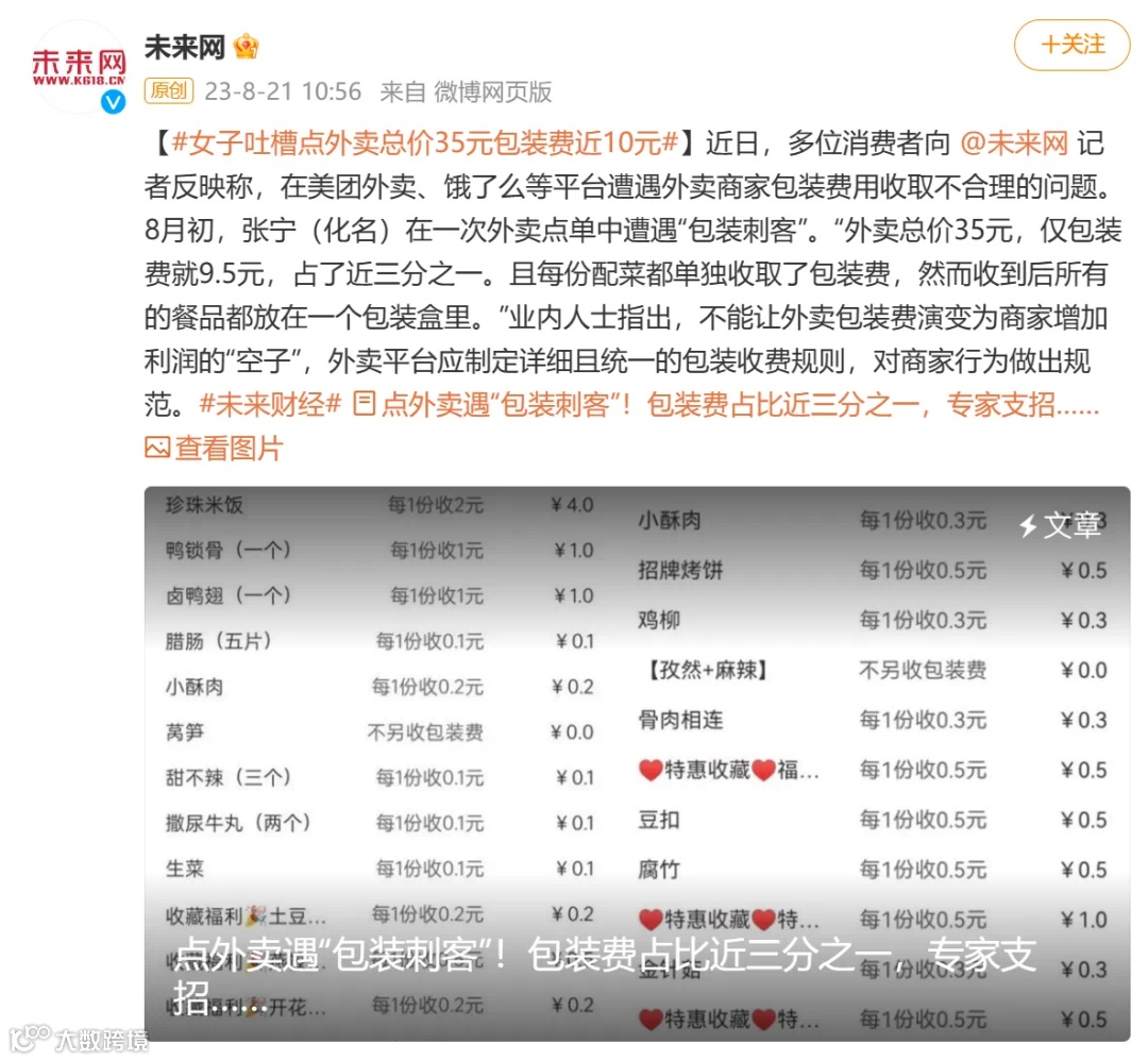The Shanghai Consumer Protection Commission in Tune called for rules on standardized and transparent packaging fees for takeaways.