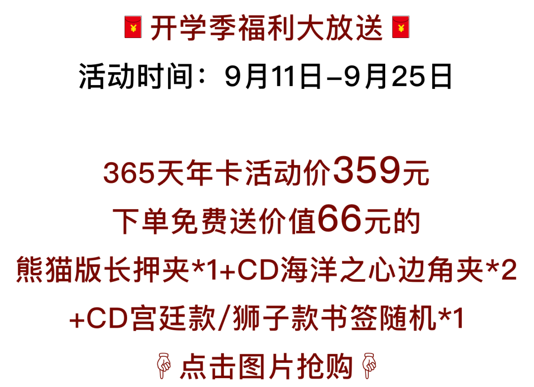 恰逢9月开学季大促活动,超多精美的China Daily文创好礼下单就免费送送送:长押夹、书签、边角夹......感兴趣的小伙伴快快上车!(购买后请于9月26日前及时填写收货地址,活动结束兑换入口将关闭)