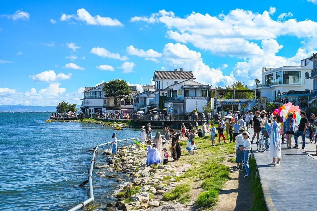 2023年10月4日,云南大理,游客在洱海生态廊道游玩、拍照。图源:东方IC