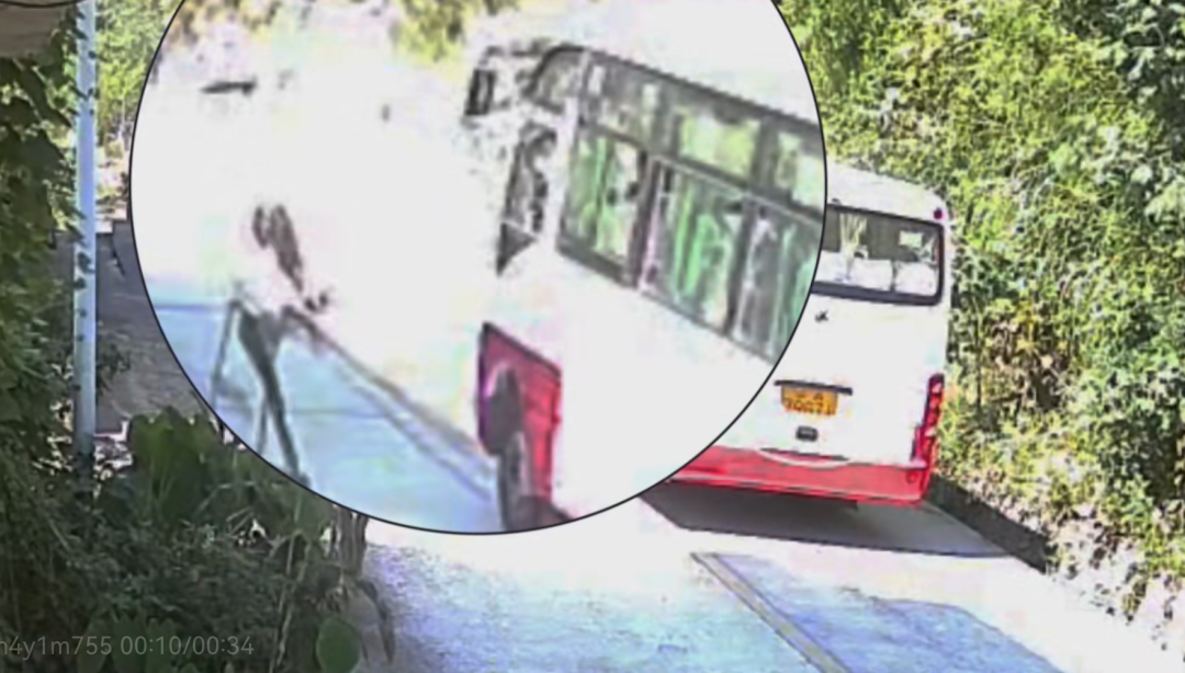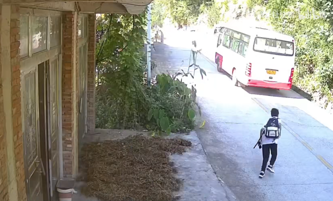 Noticing a schoolbag hanging from the doorknob of an old house along his route, the bus driver pulls over and honks gently to answer the "code". After a moment, he leans out of the bus and shouts a loud reminder. A boy then rushes outside, grabs the school bag, and boards the bus.