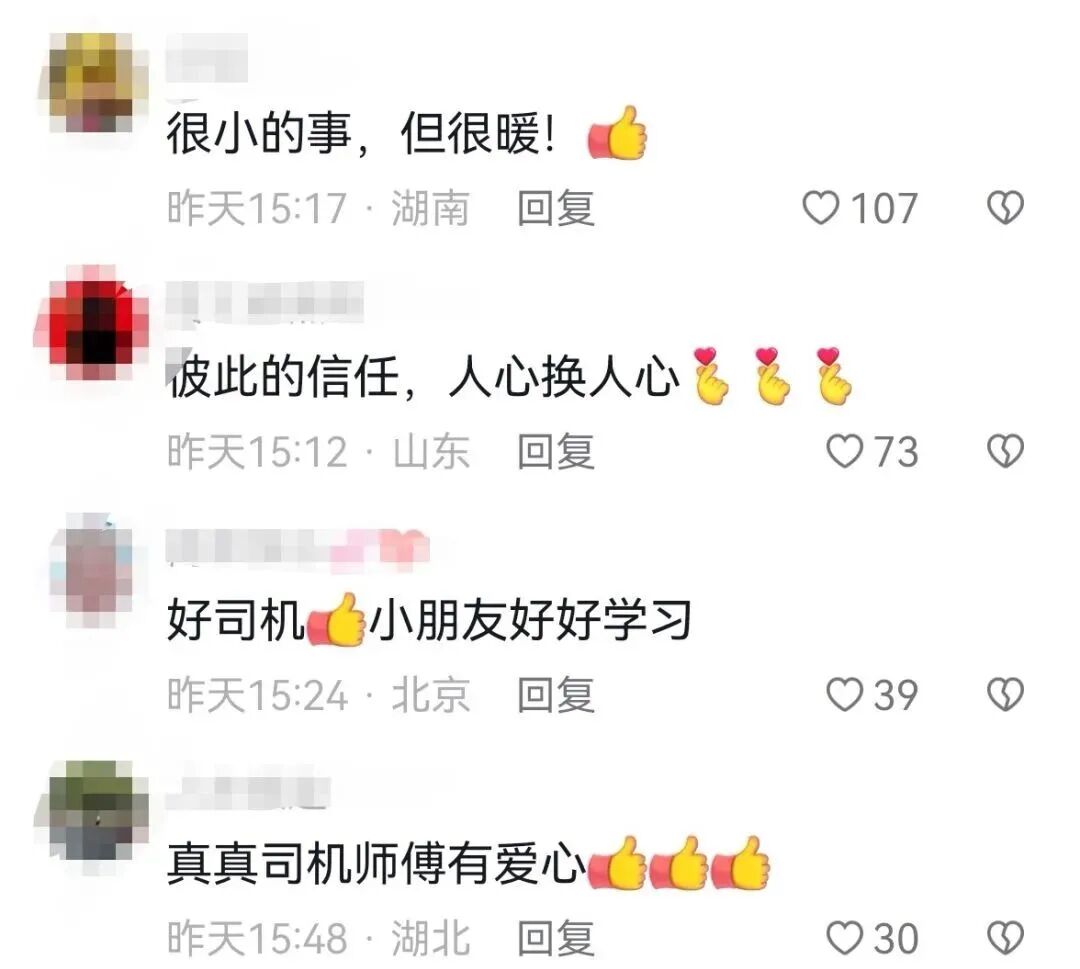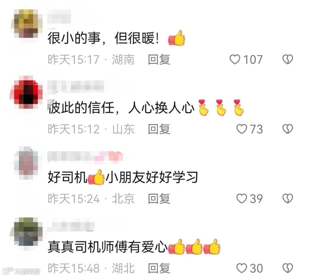 其他网友的留言同样动人:“书包是他们的暗号,更是双向奔赴的爱”。“虽然孩子不在父母身边,但仍然有人温柔以待”。“泪目了!一声鸣笛、一脚刹车,温暖了孩子的年少时光啊……”