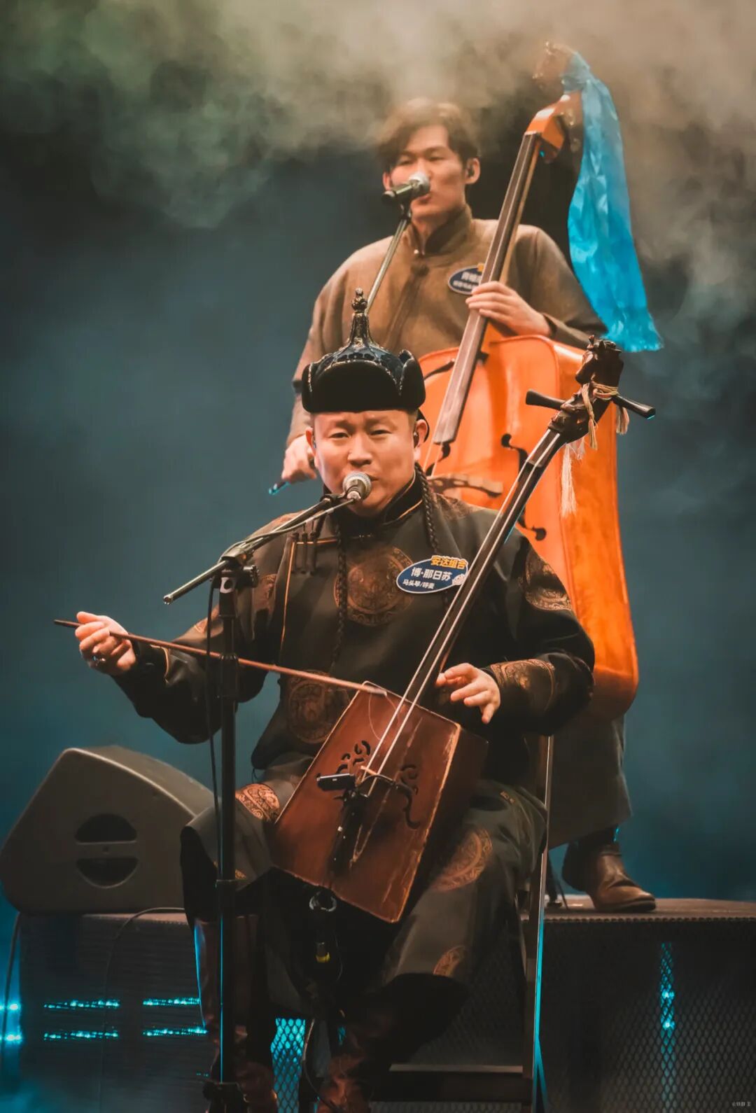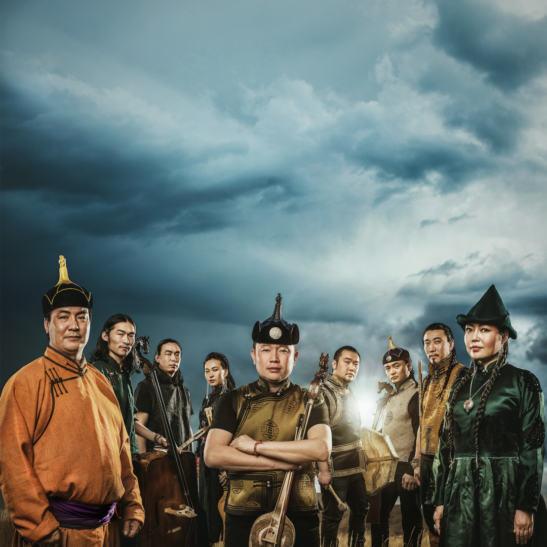 Clad in traditional Mongolian robes, leather boots and headgear, the nine musicians played acoustic instruments that included the morin khuur (the horse-head fiddle), and the topshur (a two-stringed Mongolian lute), along with percussion and a box-shaped double bass.