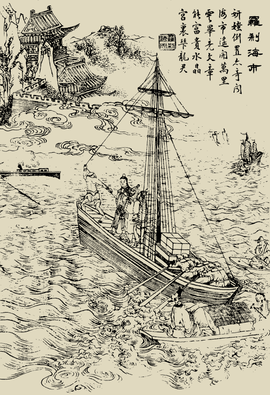 问:“海市何地?”曰,“海中市,四海鲛人,集货珠宝。四方十二国,均来贸易。中多神人游戏。云霞障天,波涛间作。”