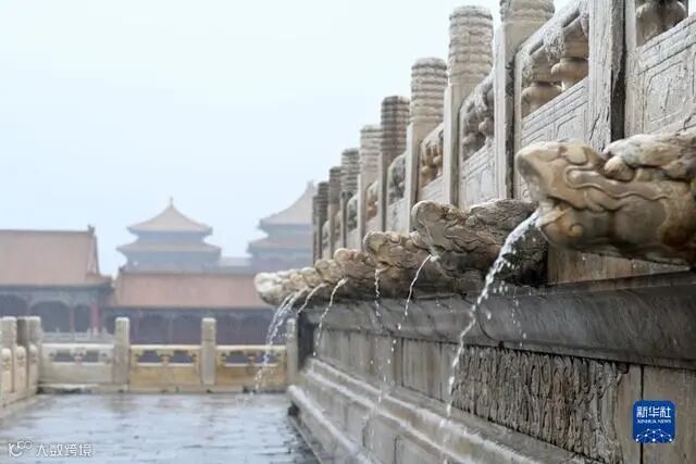 连日来,北京遭遇强降雨天气,故宫再现“九龙吐水”。依靠精妙的排水系统,宏大的故宫建筑群,在暴雨中安然无恙。