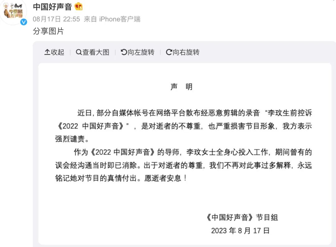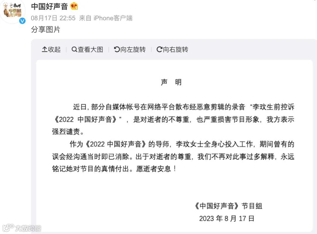 The official Sina Weibo account of The Voice of China released a statement on Thursday, saying that the audio in which Lee made accusations against the show before her passing had been maliciously edited.