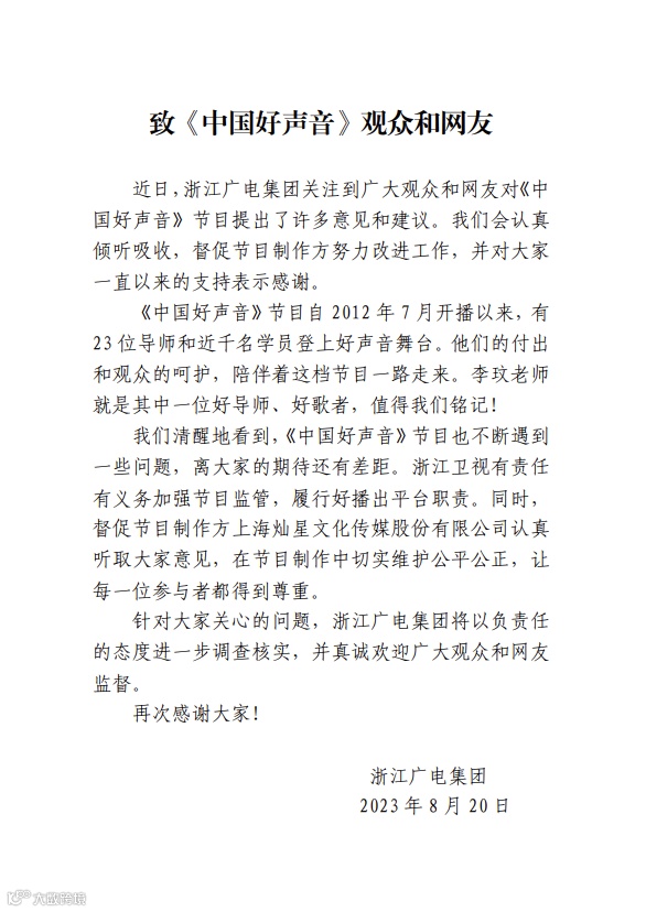 8月20日晚,浙江广电集团网站发布“致《中国好声音》观众和网友”的公告,对此事作出回应: