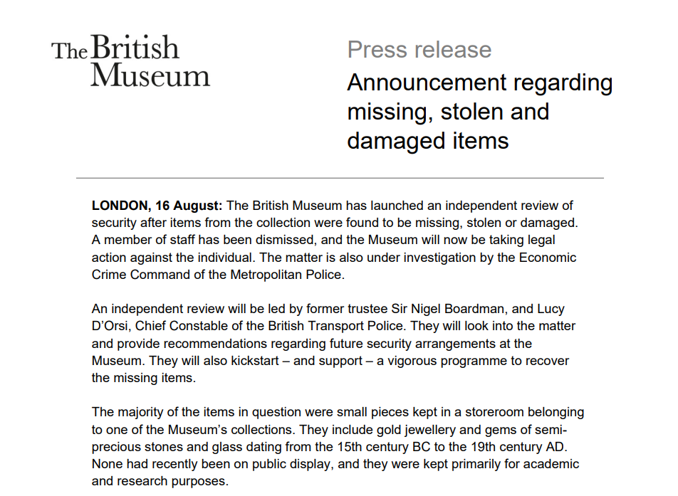 藏品丢失的具体时间没有说明,但据大英博物馆董事会董事长乔治·奥斯本的说法,董事会成员在“今年早些时候”得知此事,非常担忧。