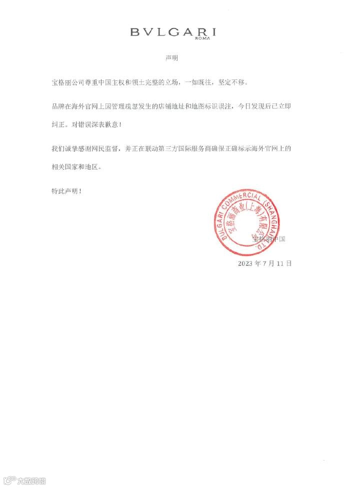 11日晚,宝格丽中国通过微博发布致歉声明: