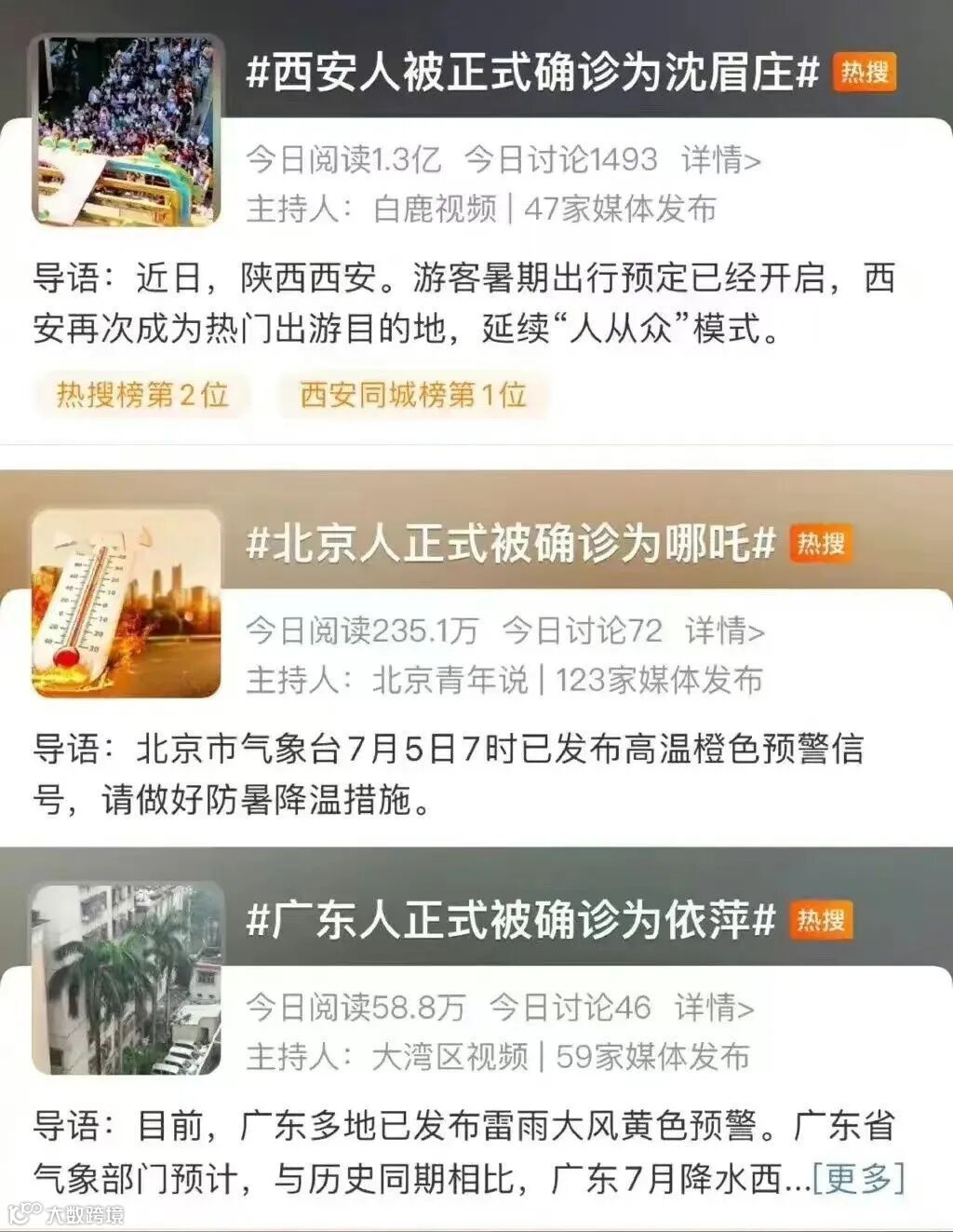 北京人被正式确诊为哪吒,因为持续的高温之下人们仿佛“脚踩风火轮”上班;西安人被正式确诊为沈眉庄,因为旅游季“人从众”模式下市民们不愿出门见人;广东人被正式确诊为依萍,因为强降雨比依萍要钱那天淋的雨还大……