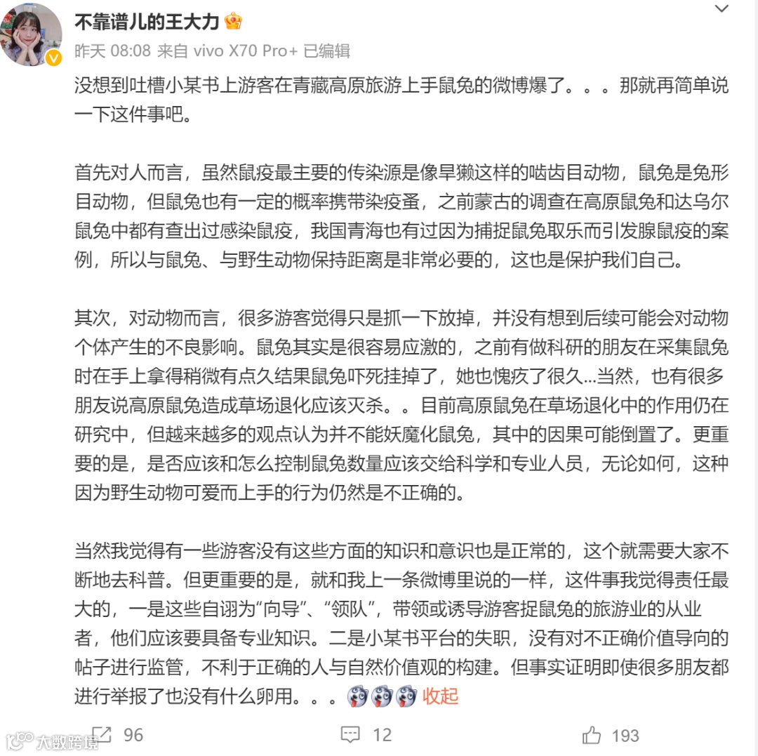 博主@不靠谱儿的王大力 在后续微博中解释道:一方面,鼠兔有一定概率携带染疫蚤传播鼠疫;另一方面,后续可能对动物个体产生不良影响。