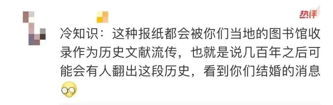 有网友则表示“以后可以和孙子孙女吹牛:你爷爷奶奶当年结婚可是上过报纸的”。