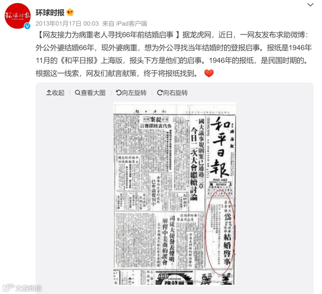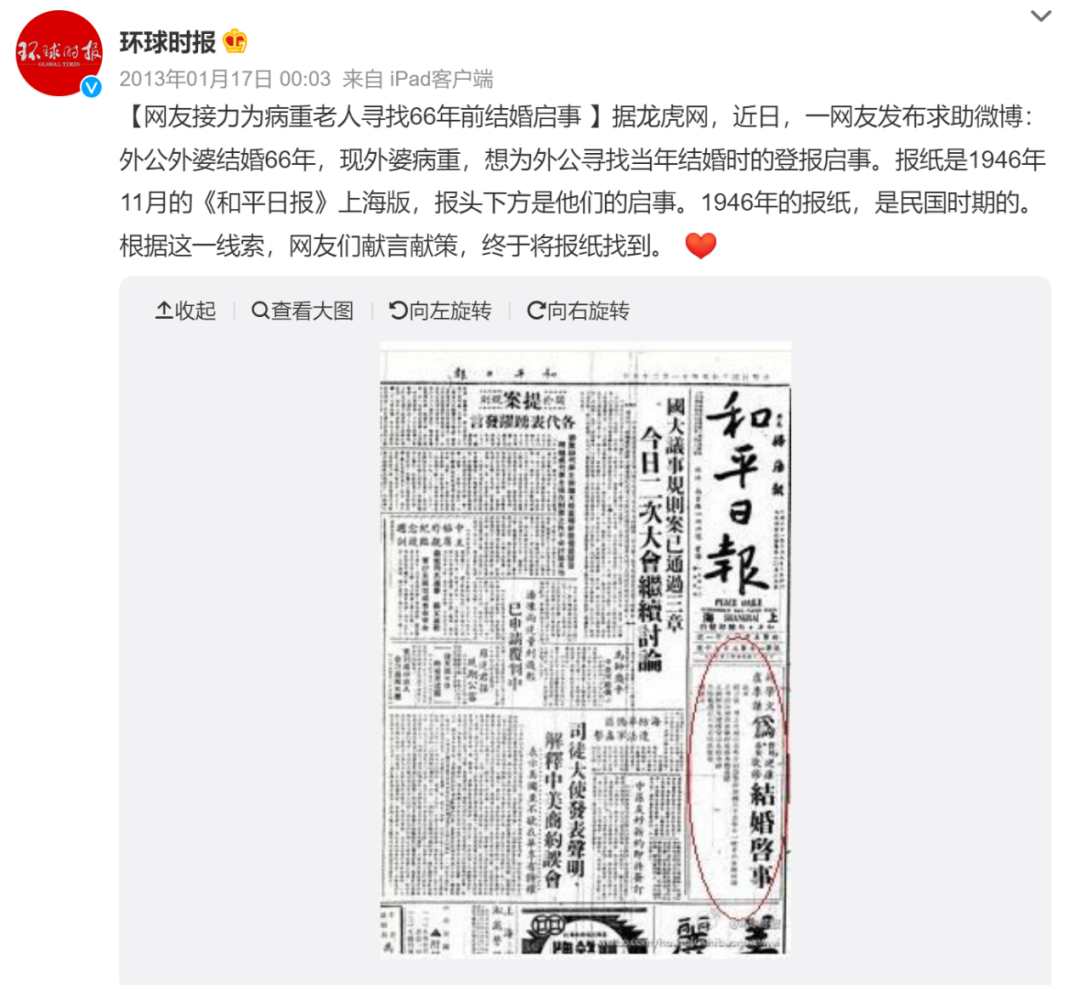 2013年,一名上海网友曾发文求助,试图寻找外公外婆刊登在报纸上的结婚启事。网友们纷纷转发接力,最终在上海图书馆的帮助下,这对老夫妻找到了当年喜结连理的印证——一份刊登在1945年《和平日报》上海版上的结婚启事,这件事感动了不少人。