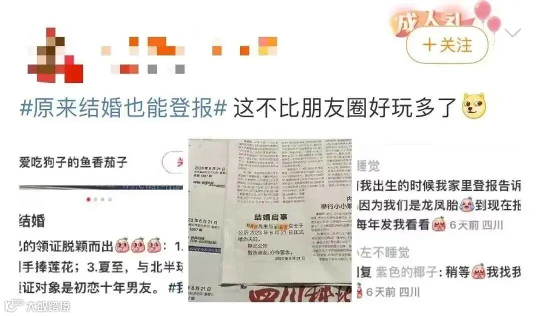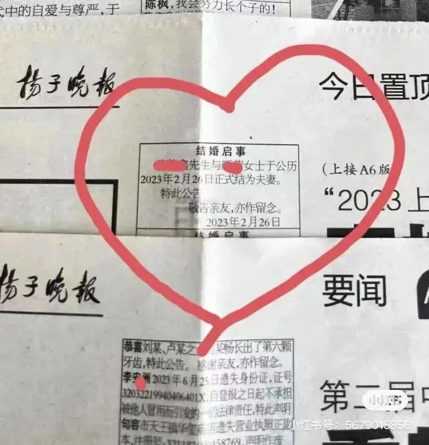 网友在社交平台晒出自己登报的结婚启事 图源:小红书