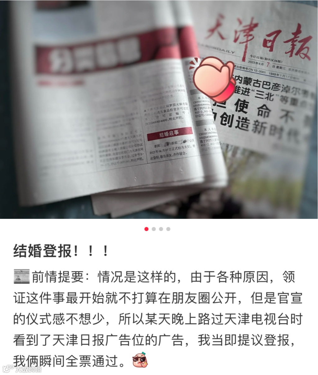 据《环球时报》报道,24岁的王女士和她的丈夫就决定采用这种经典的方式在家乡的《天津日报》上刊登了他们的婚姻启示。
