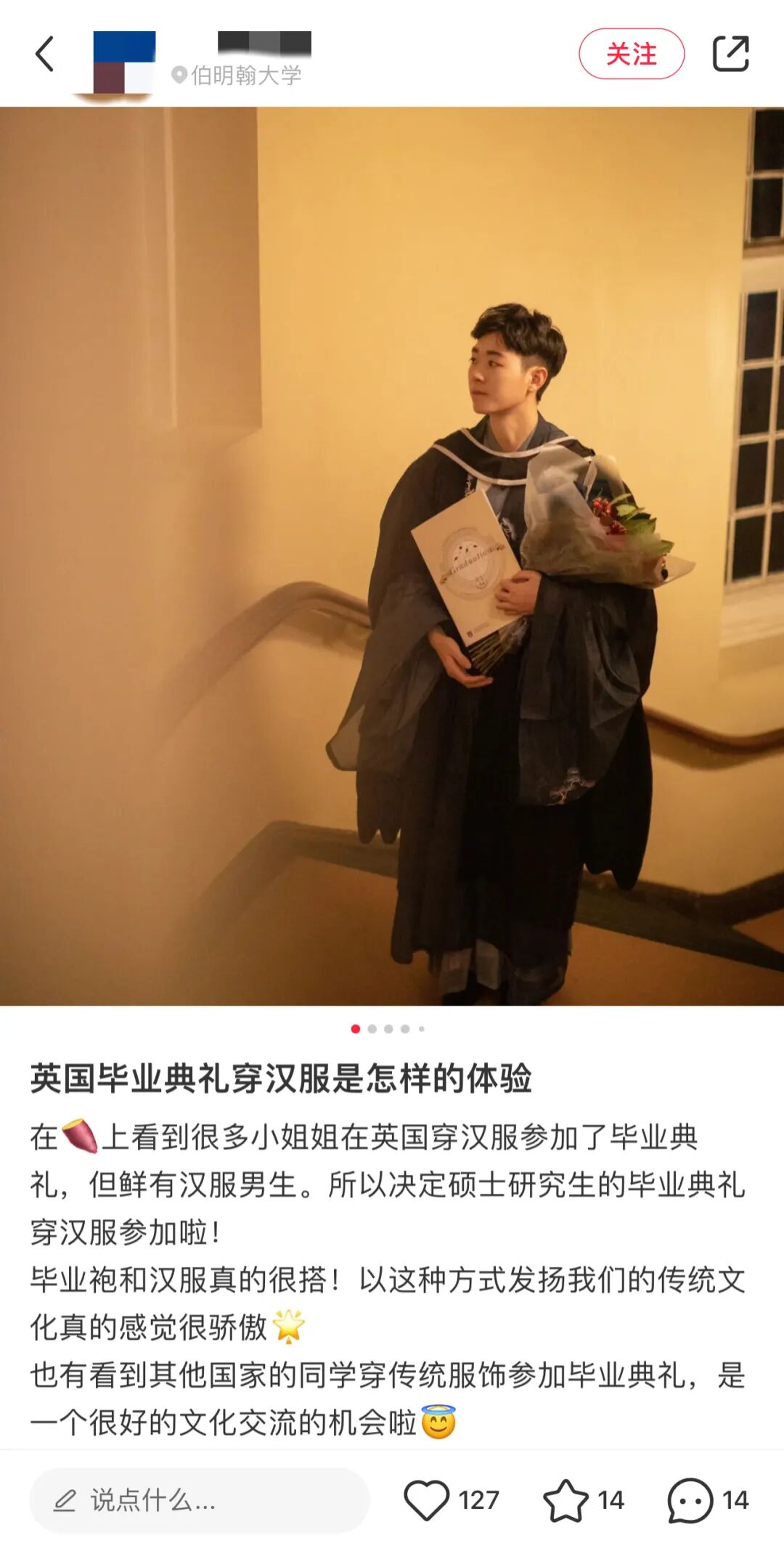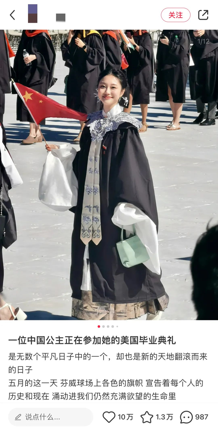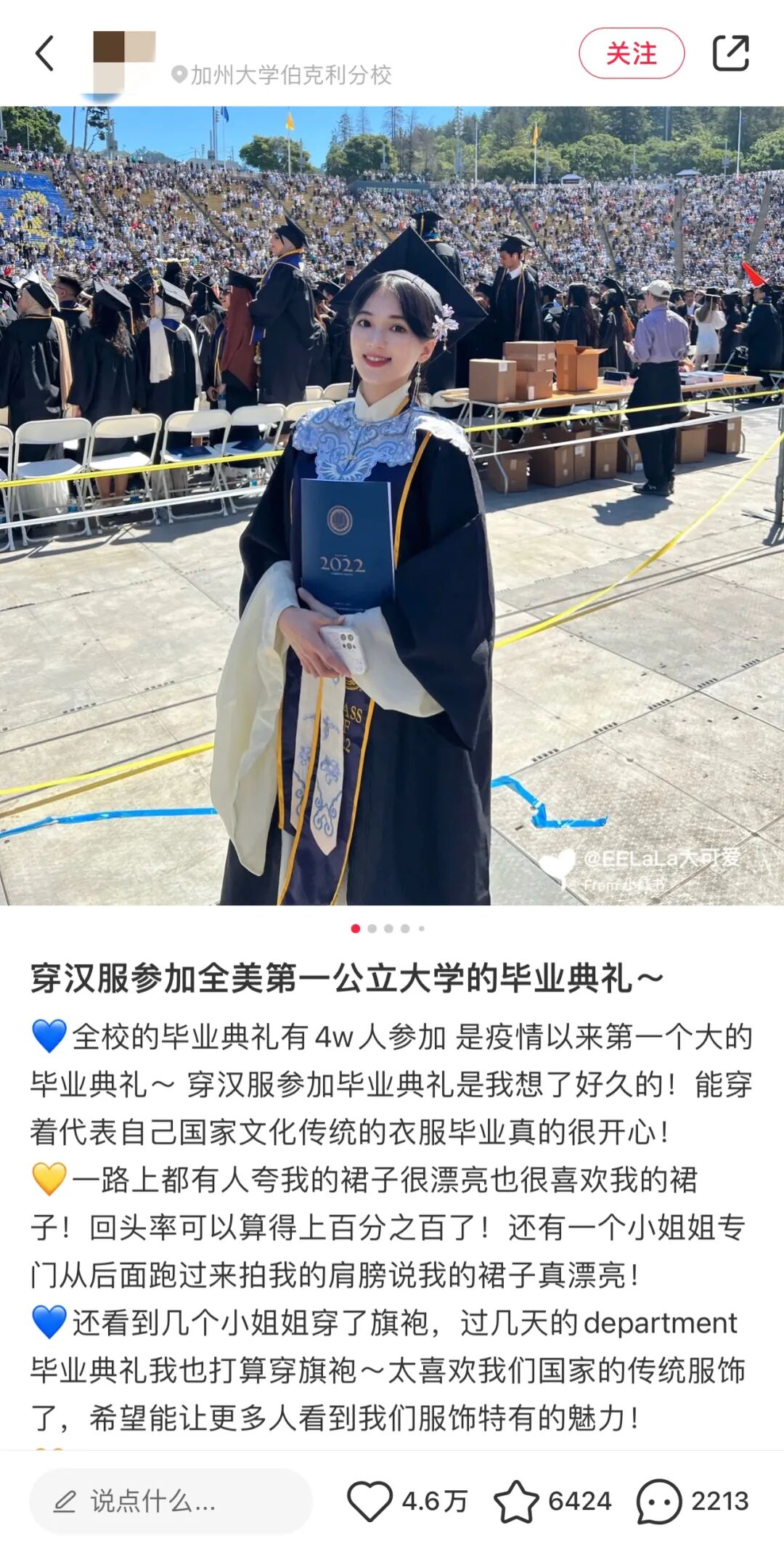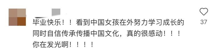 "When wearing traditional clothing at important moments in life, I truly feel a sense of pride. As the only Chinese person in my department, I have been striving to incorporate elements of our Chinese culture into my everyday studies and endeavors, bringing forth the essence of who we are as Chinese people." The student explained her action of wearing Hanfu for her graduation ceremony.