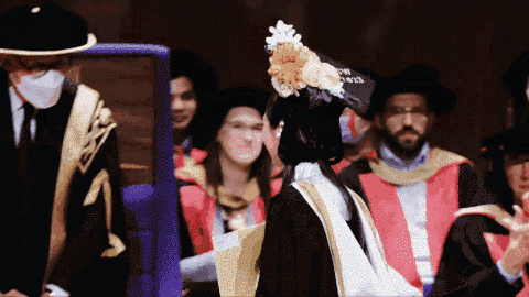 Similarly, a student studying in Australia shared a video of herself attending her graduation ceremony wearing a horse-faced dress, complemented by floral hair adornments.