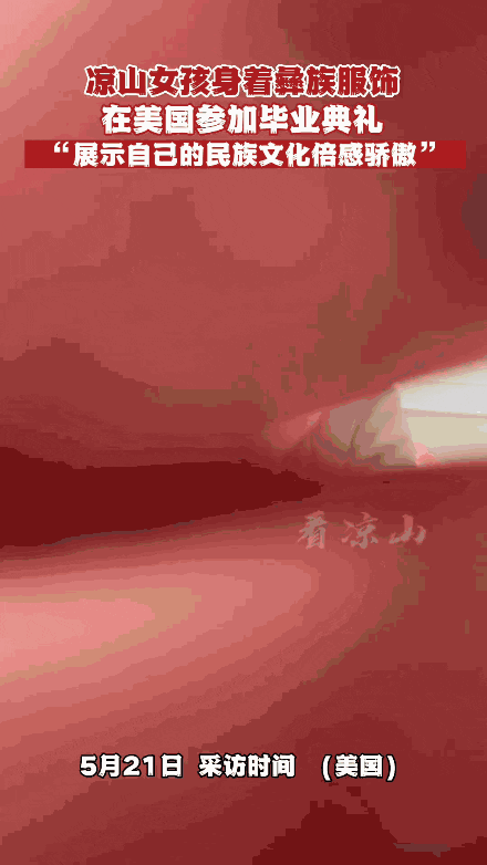 For instance, on May 21st, Shama Pacha, a girl from Liangshan, Yi autonomous prefecture, participated in a graduation ceremony in the United States dressed in Yi ethnic attire. She expressed the significance and honor of wearing her ethnic clothing in a foreign land, taking pride in showcasing China's diverse culture to foreigners, particularly on such a special occasion.