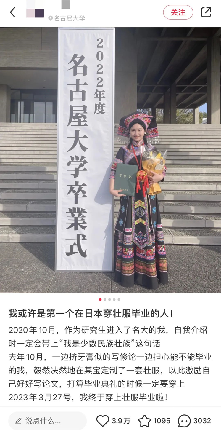 Similarly, a female student studying in Japan wore Zhuang ethnic attire to her graduation ceremony.