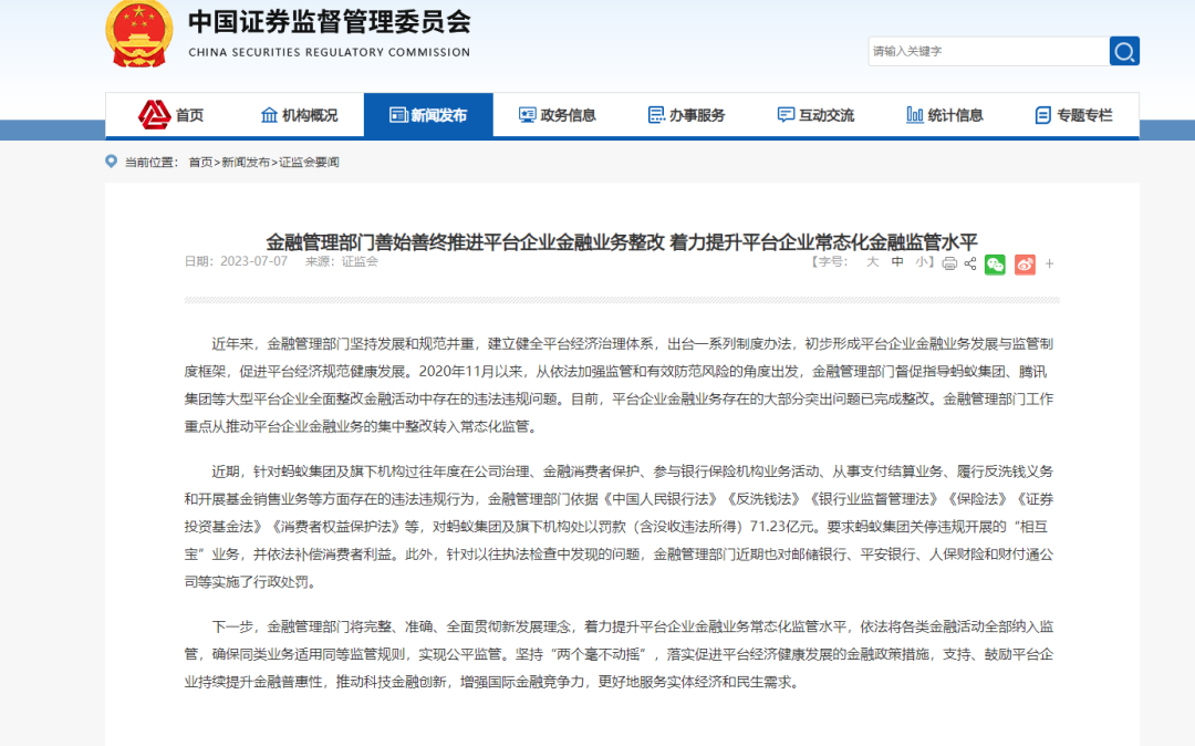 Currently, the special rectification work on most of prominent problems concerning major platform companies' financial activities has already completed, according to the China Securities Regulatory Commission.
