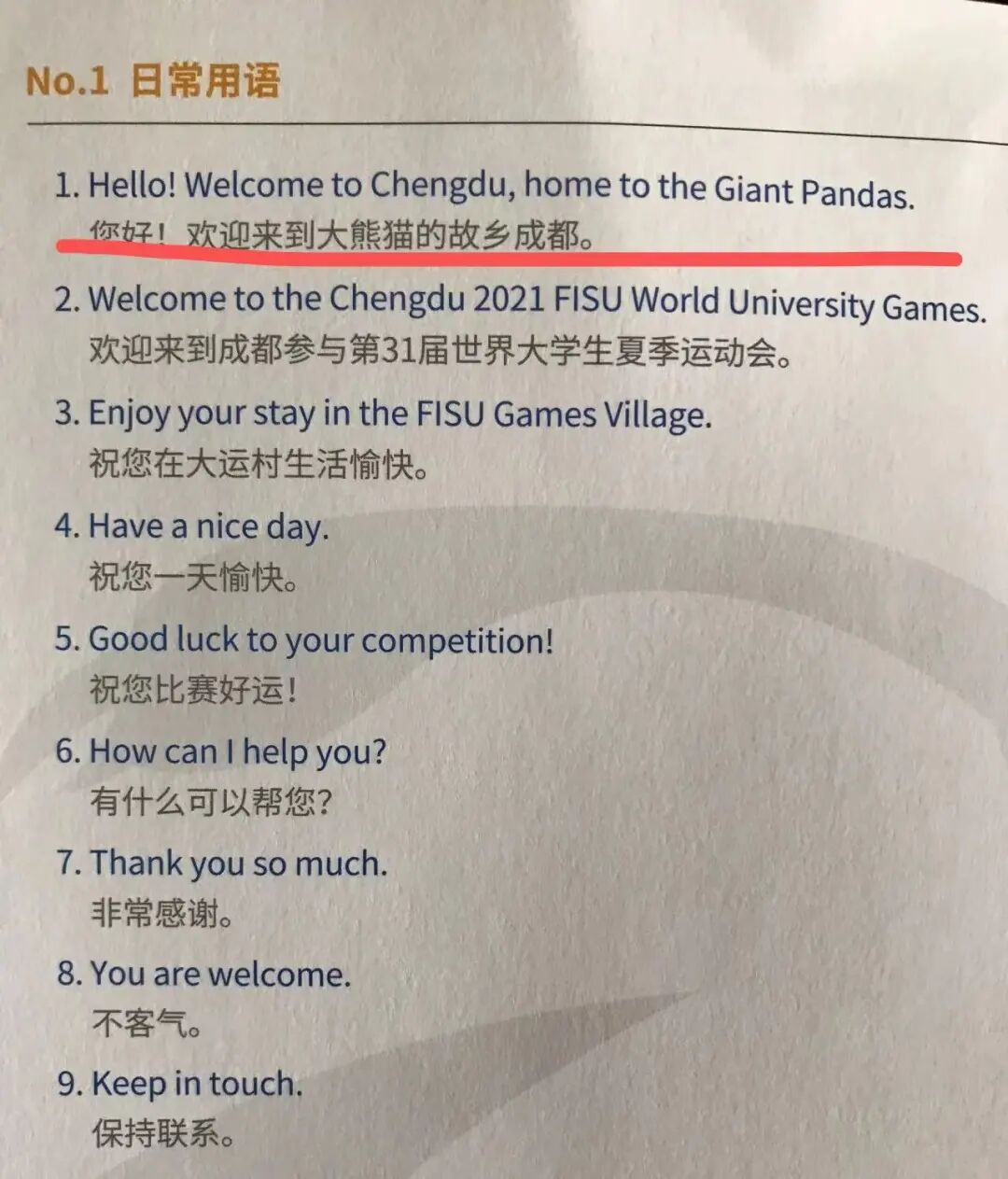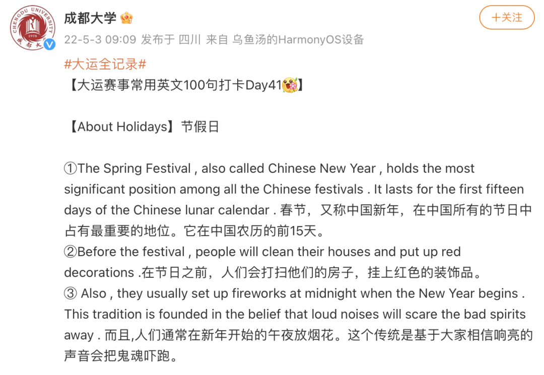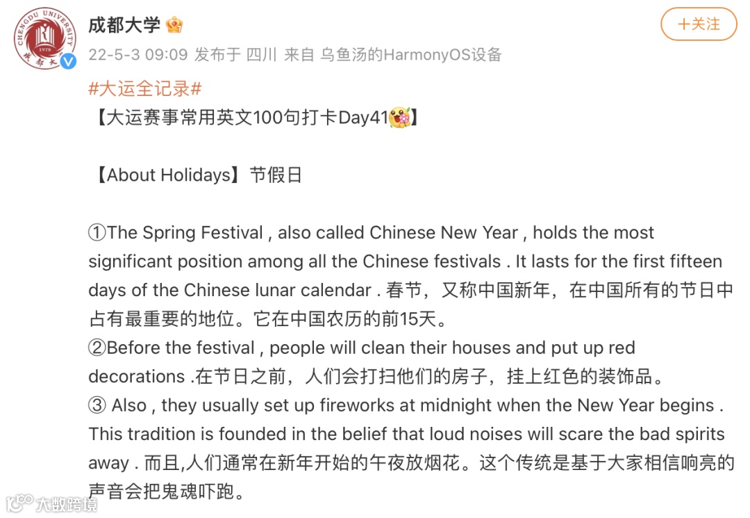其实,为迎接大运会的到来,热情的成都人民早就研究出了好几份整活版“川式英语”,在社交媒体平台上广泛传播,主打的就是一个英语速成。
