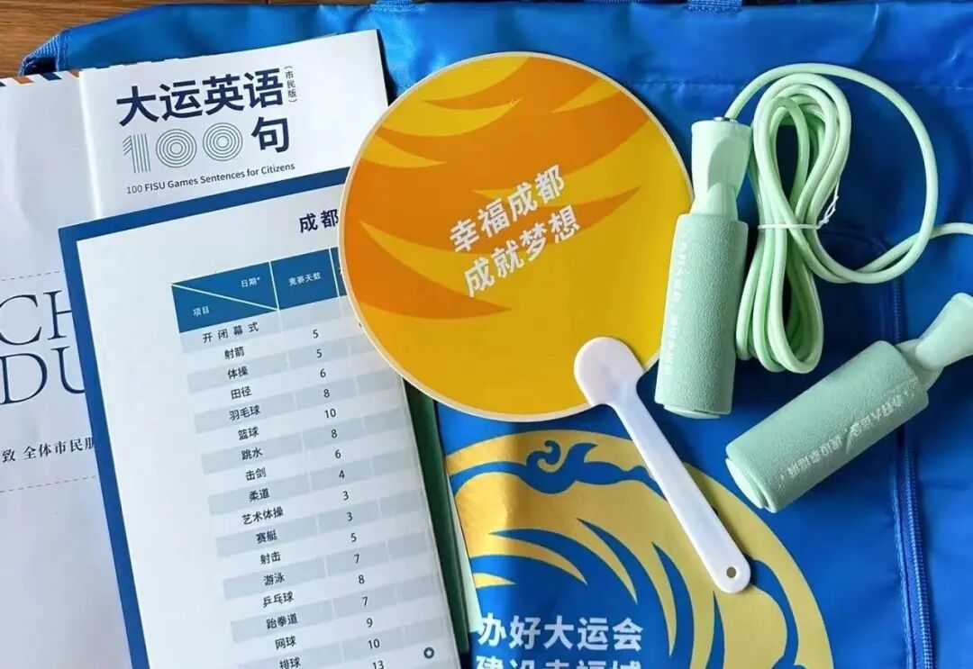 成都为全体市民派发了“大运限定盲盒”,包括帆布包、小布巾、扇子、场馆地图,大运会英语100句小册子等。