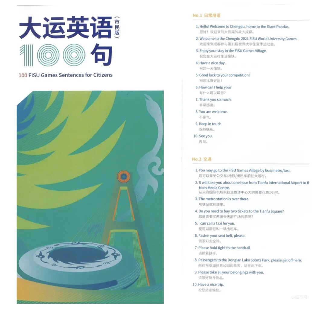 其中《大运英语100句》的小册子,内容生动有趣,主打一个热情好客,涵盖交通、住宿、餐饮、旅游、购物等多个板块。