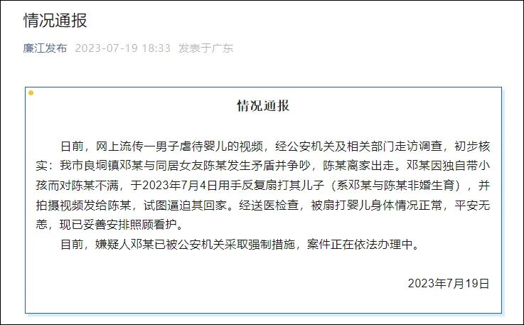 7月19日晚,广东省湛江市廉江市官方微信公众号“廉江发布”就网传一男子反复扇打婴儿的视频发布情况通报。目前,嫌疑人邓某已被公安机关采取强制措施。