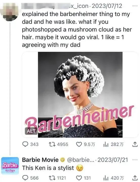 网传的合成图片上还出现了“蘑菇云”等关于原子弹的元素,《芭比》的官方推特账号还积极在一些发布“芭本海默”合成图片的帖子下留言,称“这个肯是个造型师”。