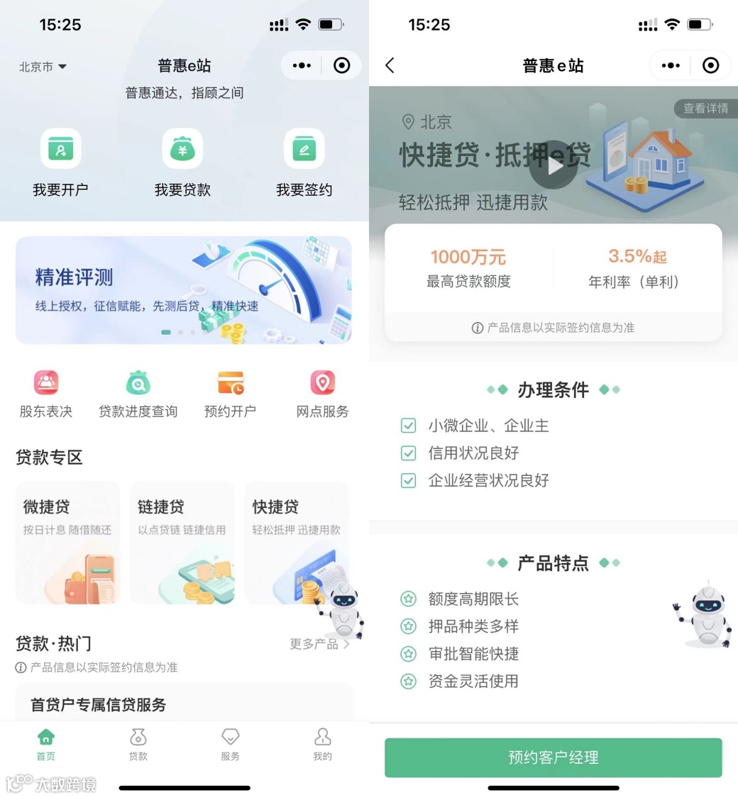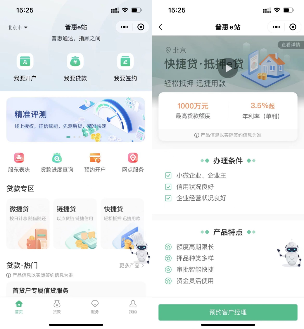 农业银行“普惠e站”包括“我要开户、我要贷款、我要签约”三大核心功能,已实现企业掌银、门户网站、H5、微信小程序全渠道布放,并开放输出至70余个外部平台,延伸普惠金融服务触点,共建小微企业发展生态,成为业界辨识度较高的小微企业金融服务品牌。