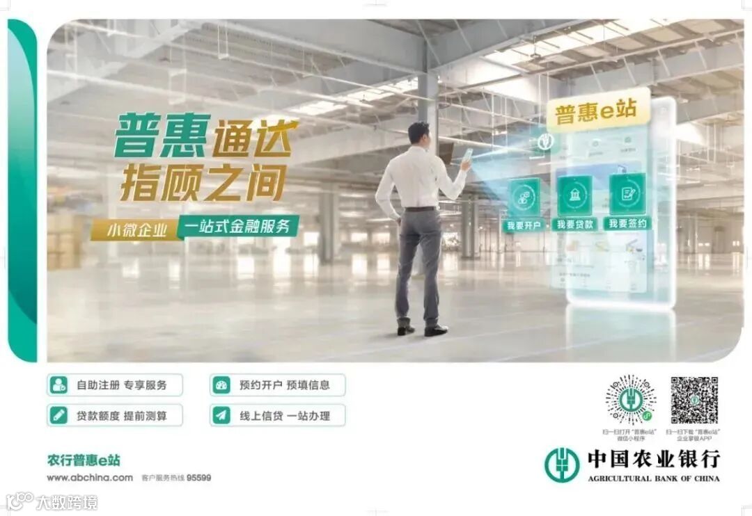 中国农业银行运用多重金融科技,为小微企业客户推出“普惠e站”专属线上服务平台,涵盖企业开户、普惠贷款等综合金融服务,为小微企业提供全线上一站式贷款服务和在线精准测额等功能,助力小微企业健康发展、不断壮大。