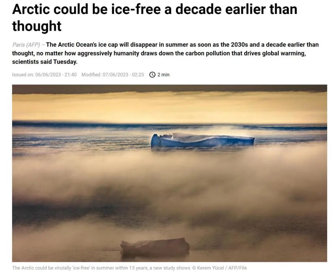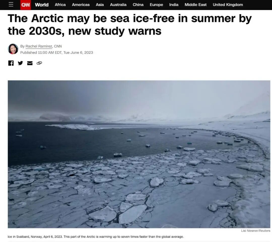 CNN6日报道:一项新的研究警告称,到本世纪30年代,北极可能会迎来“无冰之夏”