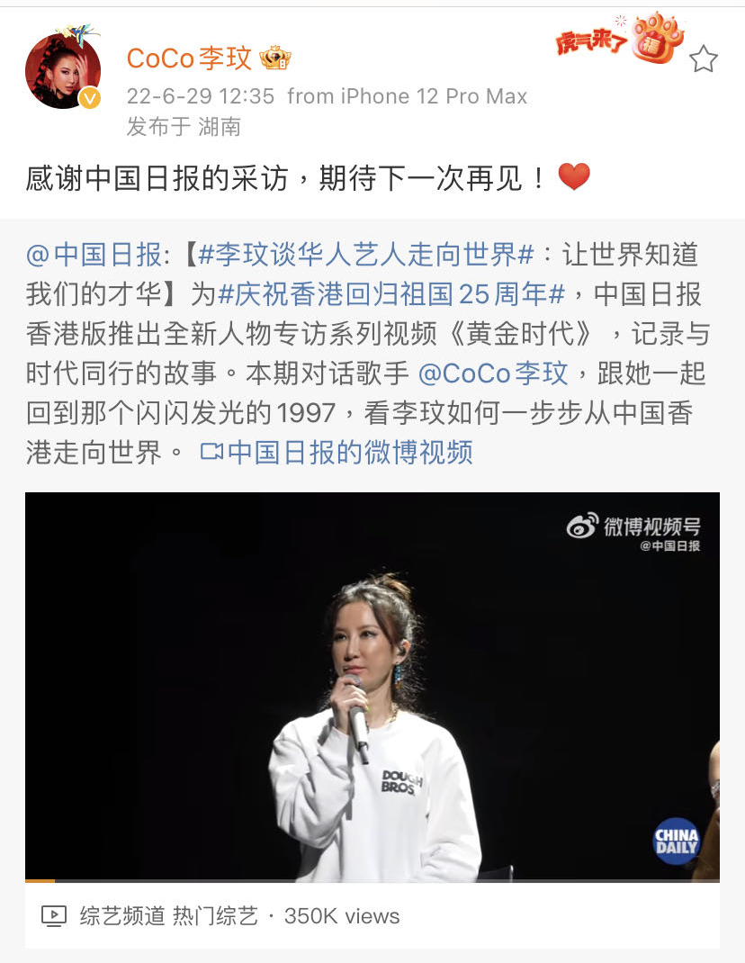 歌手李玟2023年7月5日因抑郁症去世,震动华人文娱圈。 一年多前,李玟接受了中国日报香港版的专访,这也成为她最后留下的为数不多的记录。 本报记者回顾了当时采访的种种细节,以记者手记的形式,用第一视角尽可能还原了一个我们见到的李玟。 李玟的黄金时代 永远都不会过去 记者 / 薛婧琪 我第一次见到李玟老师,是2022年5月27日,她正在长沙录制《声生不息港乐季》。 这是来之不易的一次采访机会,在见到她本人之前,所有人都是紧张的:紧张地调试设备、紧张地查看画面、紧张地准备问题。 她的声音比人更早出现在身后,我听到了李玟在叫我的名字。她第一时间走上来握住了我的手。此时脑子里不断闪过的记忆碎片全部汇作一个整体,变成了对面那个笑眼弯弯的、真实的李玟。 坐下之后,她先是注意到相机背后的两位同事都是女生,于是笑着说:“Hi Ladies,你们要不要都坐下“?然后又转过头关心我的坐姿是不是舒服,配合着镜头所有的需求。她太亲切,亲切到我难以将眼前的她与她那些名震江湖的称谓联系起来。 采访围绕着她见证、参与的港乐黄金时代的故事展开,她毫无保留地将自己前半生的经历分享给了我,说出了一长串她认为代表港乐的传奇人物,我补充说你也是传奇之一呀,她愣了一下马上回复了谢谢,同时低了低头害羞说自己不敢当。 因为她意外的健谈、开朗、真诚,原本半小时的采访持续了将近两个小时,我们聊到她早年如何独自闯荡江湖,聊到她在国外作为华人遭受歧视和恶意,聊到女性的乘风破浪何其珍贵,聊到她那些不算特别美好的少年事,聊到她从未宣之于口的伤痛,聊到想要活在当下和珍惜每一刻的心愿。 她的开朗、豁达和真诚在采访中完完全全地传递给了我。 正因如此,直到落笔的这一刻,我仍然无法相信她已离开我们的这个事实。现在回头发现,原来当时她已深受病痛困扰,但她的笑容和温暖没有因此消失,反而在采访中数次鼓励大家乐观面对生活,镜头记录下了这些片段,我想这也是她希望留给大家的记忆。 访问的最后一个环节是写下对未来的香港和自己的寄语,李玟对着我们递上的纸笔显得有一些犹豫和慎重,她思考了一会儿说:“这是要在纸上写下的文字,将来会是很重要的留存,我要认真想好内容再写”。我在第二天的彩排现场如期收到了李玟的手写信: To Hong Kong: I love Hong Kong. You’re one of the most beautiful and welcoming international cities in the world. Keep going, keep shining…我爱香港,你是世界上最美丽、最热情、最国际化的城市之一,要继续闪耀。 To myself: Keep doing what makes you happy! You only got this one life to live, so live it with meaning…人生只有一次,去做自己喜欢的事,去做有意义的事。 作为记者,我曾遇到过很多人,见过很多种或努力或艰难的平凡生活,也见过聚光灯下政商文体不同领域的五彩斑斓,我很庆幸自己的职业可以观察、体验到各种各样的人生,也将一如既往、全力以赴地完成每一个人的故事,因为我们不知道下次是哪次,再见是哪一天。 李玟是我采访的第一位歌手,是过去一年只要想起仍会感到温暖的人,很幸运能跟如此温柔的人有过交集。 属于CoCo李玟的黄金时代不会过去,每次想到你,都有好心情。