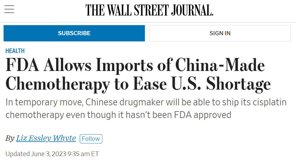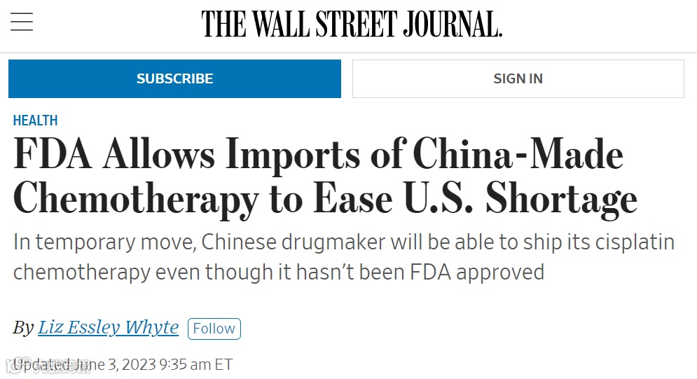 The US Food and Drug Administration is working with Qilu Pharmaceutical, a drug manufacturer in China, to import the chemotherapy drug cisplatin, a strategy aimed at ramping up supply amid an ongoing shortage of the drug in the United States.