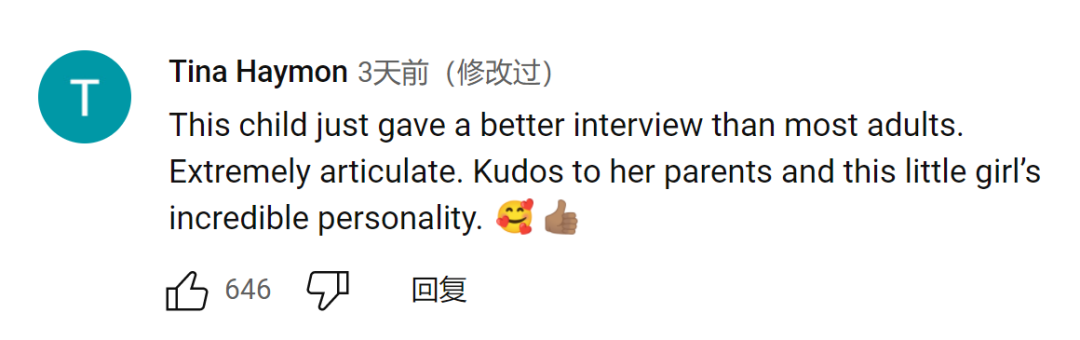 这个孩子在接受采访时说得比大多数成年人都要好。她极其善于表达。为她的父母和这个小女孩超棒的性格点赞。